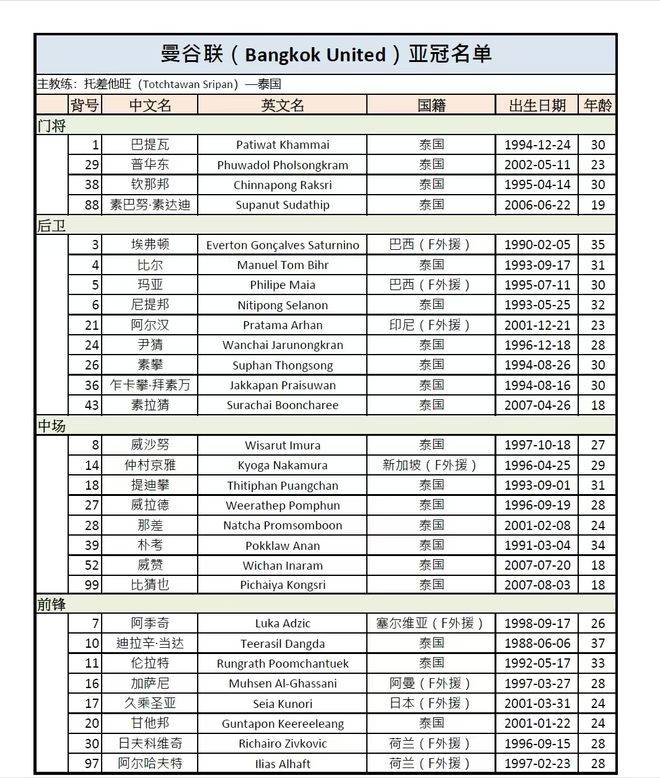 蓉城亚冠对手曼谷联球员名单:8个前锋5个是外援