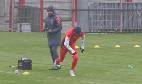 当球队、教练和工作人员仍在从德国杯1/8决赛客场3-2战胜柏林联合的途中时,穆西亚拉正在慕尼黑的训练基地单独训练。拜仁团队于周四11:49和11:53乘坐两架私人飞机降落在位于慕尼黑西侧的奥伯法芬霍芬,之后全队乘两辆大巴前往28公里外的塞本纳大街。