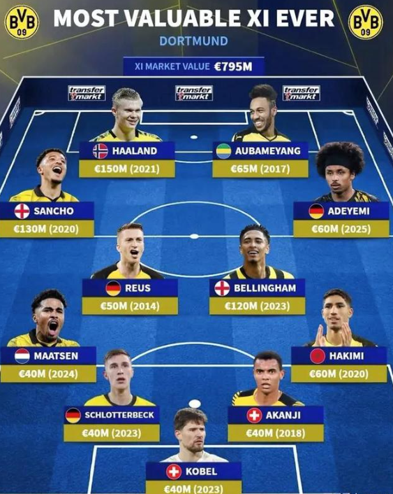 最后来看一下德转最新罗列出的多特蒙德历史最贵11人阵容,总身价高达7.95亿欧元。除了上述所陈述的球员外,还包含了门将科贝尔,后卫阿什拉夫、阿坎吉、施洛特贝克、马特森;中场阿德耶米和罗伊斯。