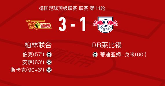 柏林联合3-1RB莱比锡,斯卡克、安萨破门
