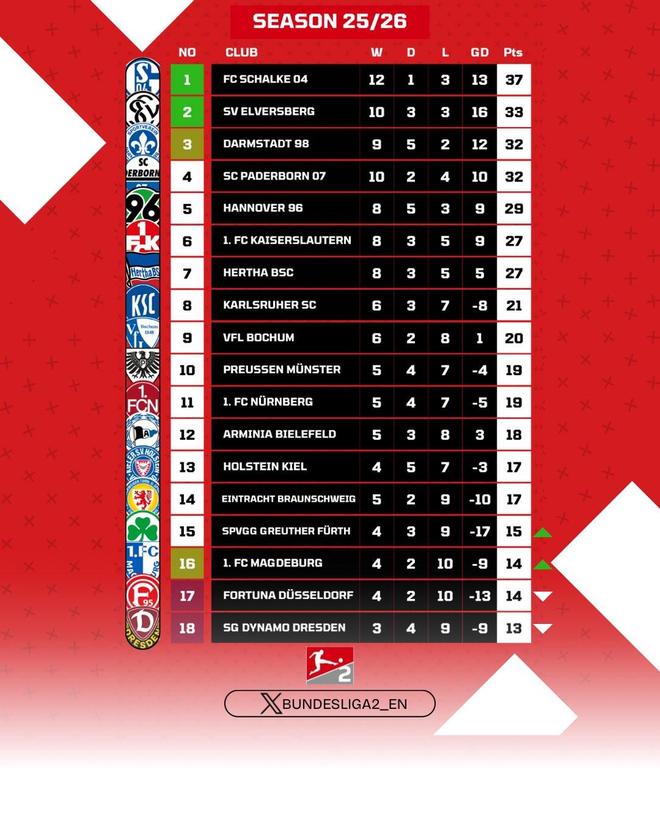 目前,沙尔克在16轮比赛过后积37分领跑德乙,第二名的埃弗斯堡16轮过后积33分,因此沙尔克提前一轮锁定德乙半程冠军。