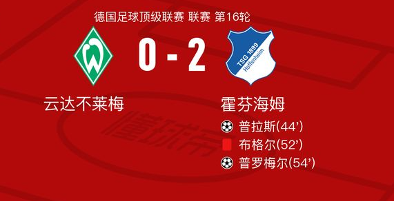 北京时间1月28日,德国足球顶级联赛第16轮,云达不莱梅主场对阵霍芬海姆。克拉马里奇送出助攻,普拉斯破门得分;随后布格尔被罚离场;普罗梅尔再入一球。最终,云达不莱梅0–2不敌霍芬海姆。