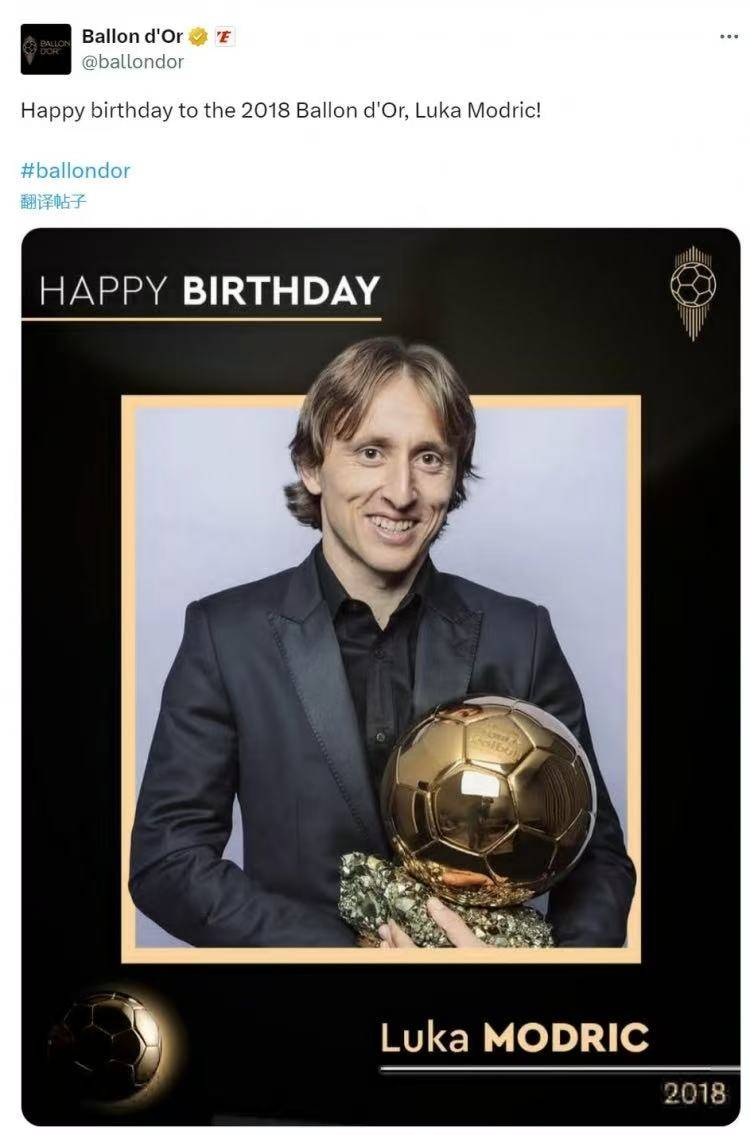 克罗地亚中场莫德里奇的40岁生日是今年的9月9日,但金球奖官方却在8月9日为他送上了生日祝福,“祝2018年金球奖得主卢卡-莫德里奇生日快乐!”随后,莫德里奇在评论区回复,“我的生日是在下个月,不过还是谢谢你!”