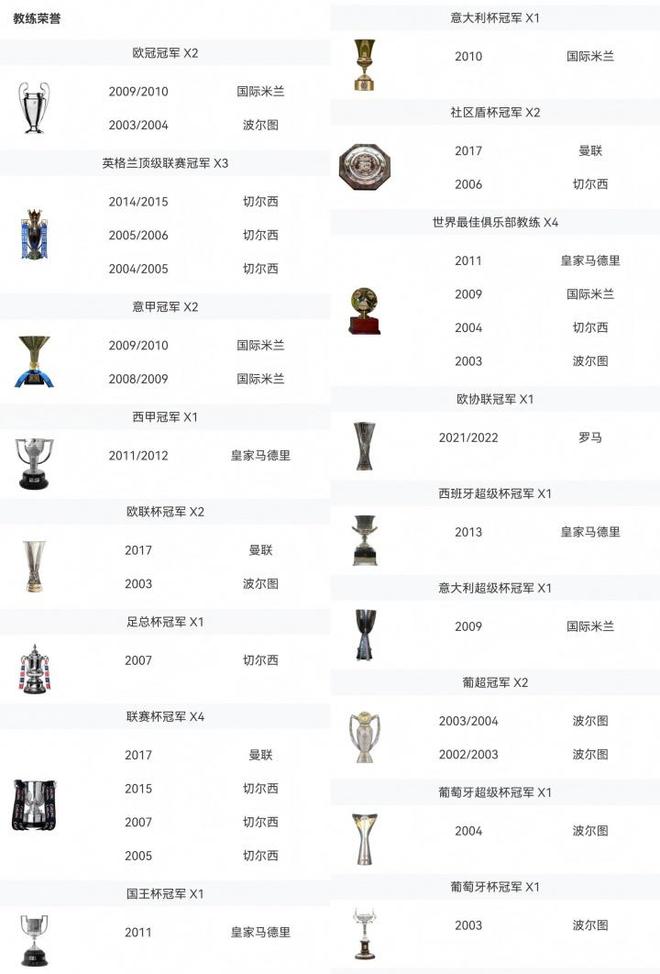 穆帅生涯26冠一览:2欧冠2欧联3英超 唯一欧战满贯