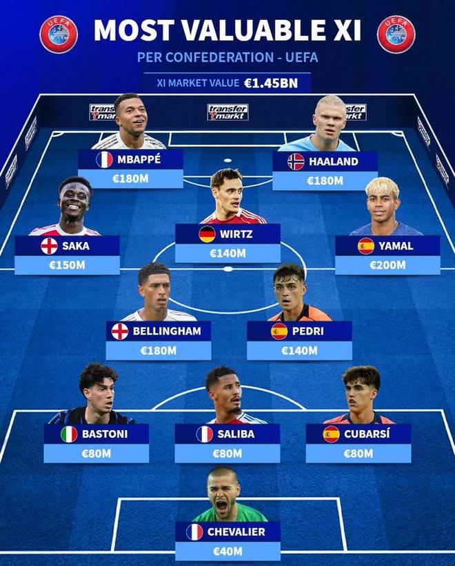 欧洲最贵11人阵容:亚马尔领衔,哈兰德、姆巴佩在列