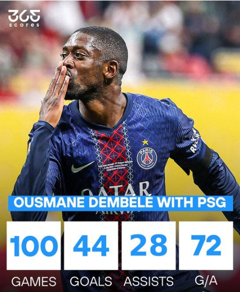 加盟球队2年多,28岁的登贝莱在巴黎出场次数达到了百场,他共制造了44球32助攻,随队获得1次欧冠,2次法甲以及多个杯赛冠军,他也赢得了今年的金球奖。