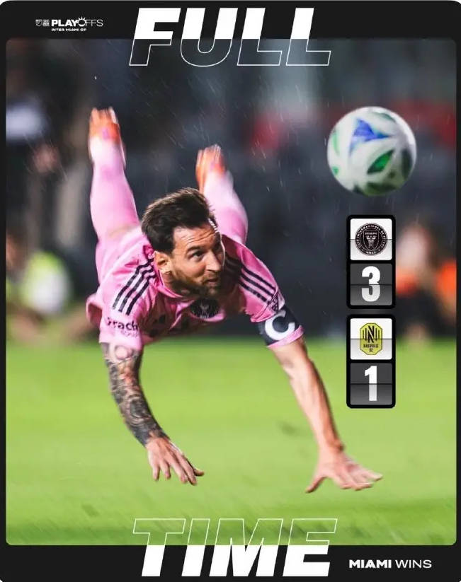 美职联-迈阿密国际3-1纳什维尔 梅西双响+鱼跃头球破门