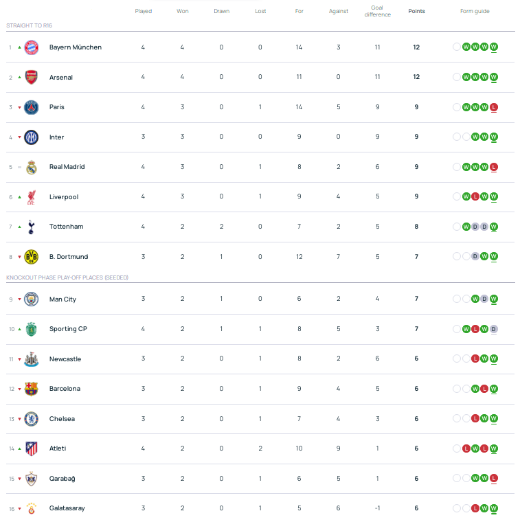 北京时间11月5日,2025-26赛季欧冠联赛阶段第4轮先战半数,积分榜情况如下: