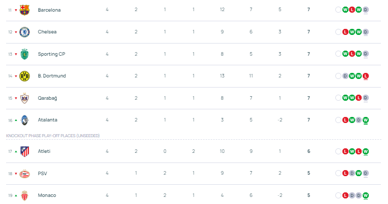 北京时间11月6日,2025-26赛季欧冠联赛阶段第4轮战罢,积分榜情况如下: