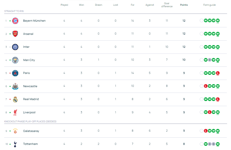 曼城3胜1平名列第四,而3胜1负的球队则包括巴黎、纽卡、皇马、利物浦以及加拉塔萨雷。