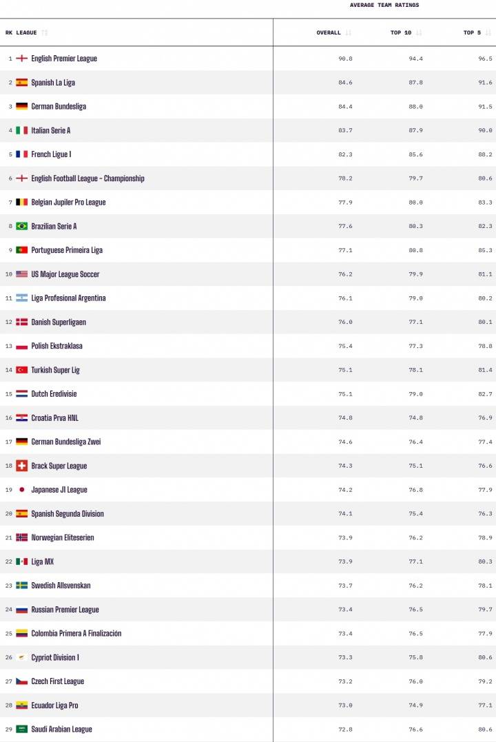 这个排名是利用OptaPowerRankings(OPTA实力排名系统),这个系统依据先进的表现指标对全球范围内的10000多支国内男子足球队和2000多支国内女子足球队的能力进行评估和评级,每支球队都会获得一个分数,从0(最弱)到100(最强)不等。通过计算每个联赛中各队的平均评分,就能确定哪些联赛集中了更多的顶级俱乐部,这能更好地反映整个联赛的整体实力。