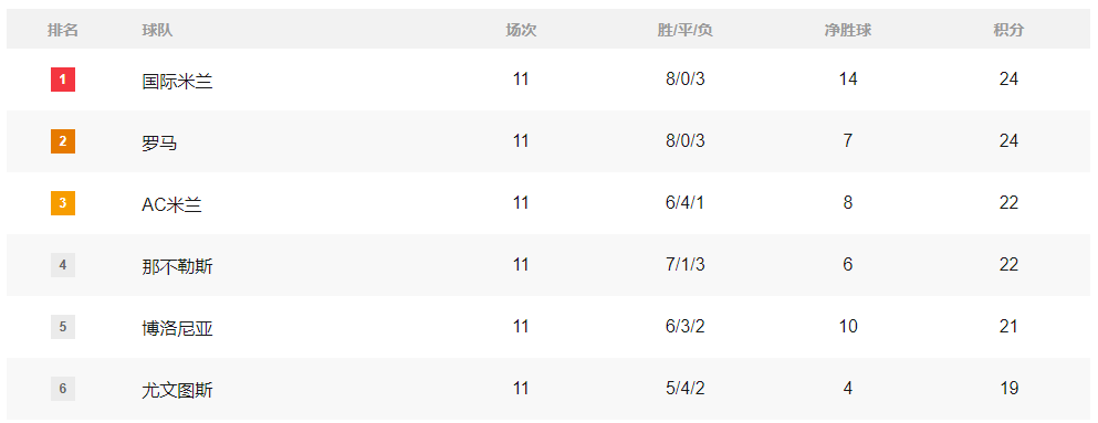 意甲方面,AC米兰2-2战平积22分,那不勒斯0-2输给博洛尼亚,罗马2-0战胜乌迪内斯,国米2-0战胜拉齐奥,目前蓝黑与红狼并驾齐驱24分领跑,米兰与那不勒斯22分,博洛尼亚也凭借本场胜利21分跻身第一集团。