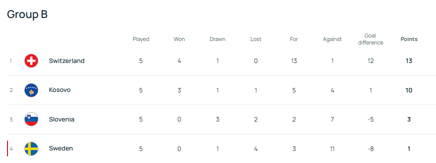 目前,瑞士积13分12个净胜球排在小组第一,科索沃积10分1个净胜球处在小组第二,斯洛文尼亚积3分-5个净胜球排在小组第三,瑞典则是5战未尝一胜,积1分-8个净胜球。世预赛欧洲区B组末轮,瑞士将与科索沃直接对话,虽然两队在积分方面只差3分,但是净胜球方面瑞士多11个,因此瑞士基本锁定了小组第一,直通世界杯在望。