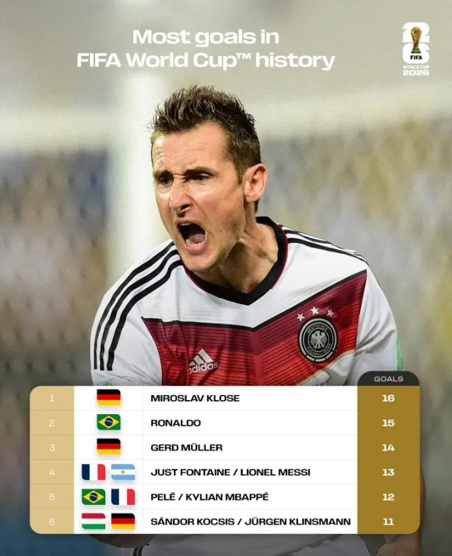 北京时间12月6日凌晨,2026美加墨世界杯将举行抽签仪式,借此机会,世界杯官方社交媒体盘点了该项赛事的历史射手榜。