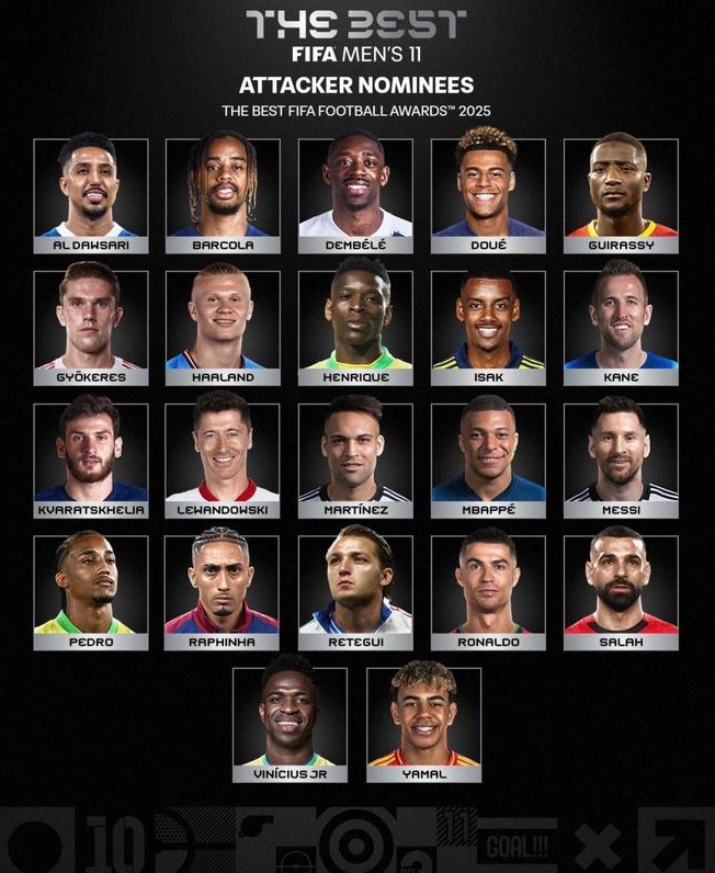 达瓦萨里、巴尔科拉、登贝莱、杜埃、吉拉西、哲凯赖什、哈兰德、路易斯-恩里克、伊萨克、哈里-凯恩、克瓦拉茨赫利亚、莱万多夫斯基、劳塔罗、姆巴佩、若昂-佩德罗、拉菲尼亚、雷特吉、C罗、萨拉赫、维尼修斯、亚马尔