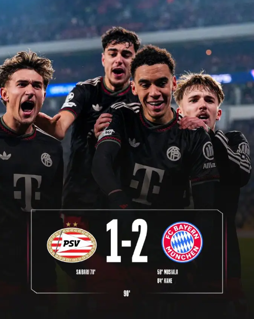 最终,拜仁2-1战胜埃因霍温,以联赛阶段第二的战绩直通16强。