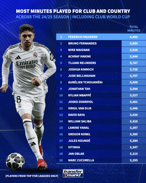 北京时间7月22日,德国《转会市场》给出了欧洲足坛上赛季球员出场时间排行榜,有趣的是,榜一大哥并非来自于欧冠冠军大巴黎,或是世俱杯冠军切尔西,而是皇马的巴尔韦德,他甚至比其他任何球员都至少多踢了500分钟左右的比赛。