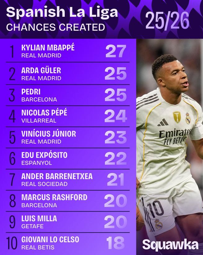 北京时间10月29日,知名数据平台Squawka列出了本赛季西甲联赛中创造机会最多的球员榜单,皇马球星姆巴佩27次领跑榜单,居莱尔、佩德里25次紧随其后。