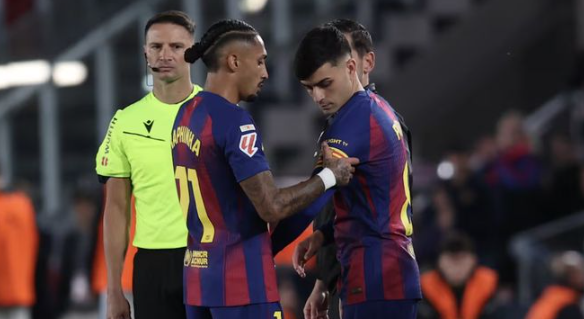 上周六,巴萨在对阵阿拉维斯时二人未能同场,但弗里克在安排拉菲尼亚下场时,正是用佩德里将其换下,拉菲尼亚离场前还将队长袖标亲手交予佩德里。