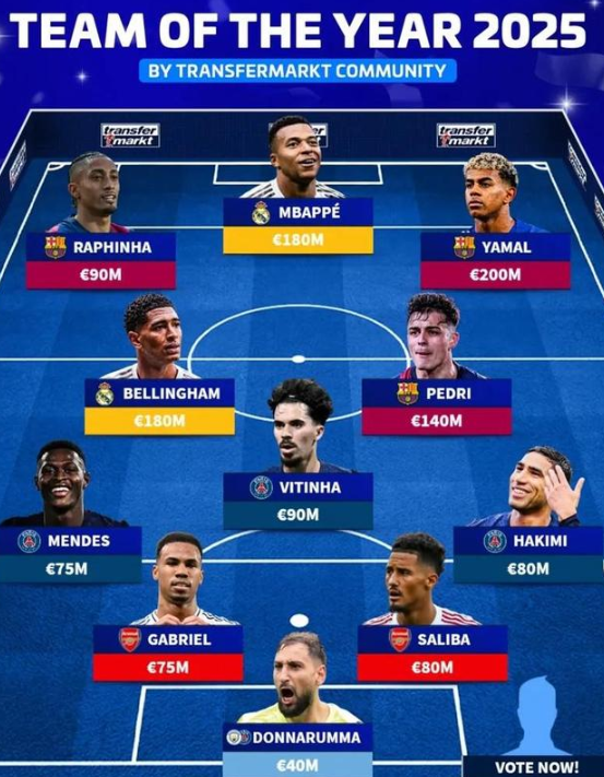 北京时间12月6日,德转通过用户投票评出2025年的最佳阵容,姆巴佩和亚马尔领衔,巴塞罗那和巴黎圣日耳曼各有3名球员入选,皇家马德里和阿森纳2人入围。
