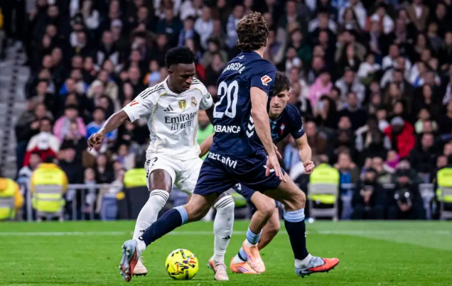 第45分钟,楚阿梅尼长传,维尼修斯推射被门将拉杜扑出。上半场结束,皇马0-0塞尔塔。