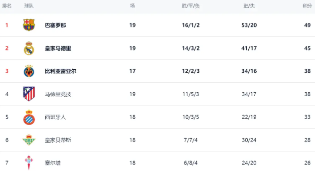在积分榜上,巴萨依然高居榜首。巴萨的战绩是16胜1平2负,拿到了49分。而赢球的皇马紧随其后,战绩是14胜3平2负,拿到45分,以4分的劣势排名第2。比利亚雷亚尔拿到38分,排名第3。战平的马竞也是38分,排名第4。不过,马竞比比利亚雷亚尔多踢了2场比赛。西班牙人本赛季成绩非常出色,拿到33分,排名第5。皇家贝蒂斯以28分排名第6。