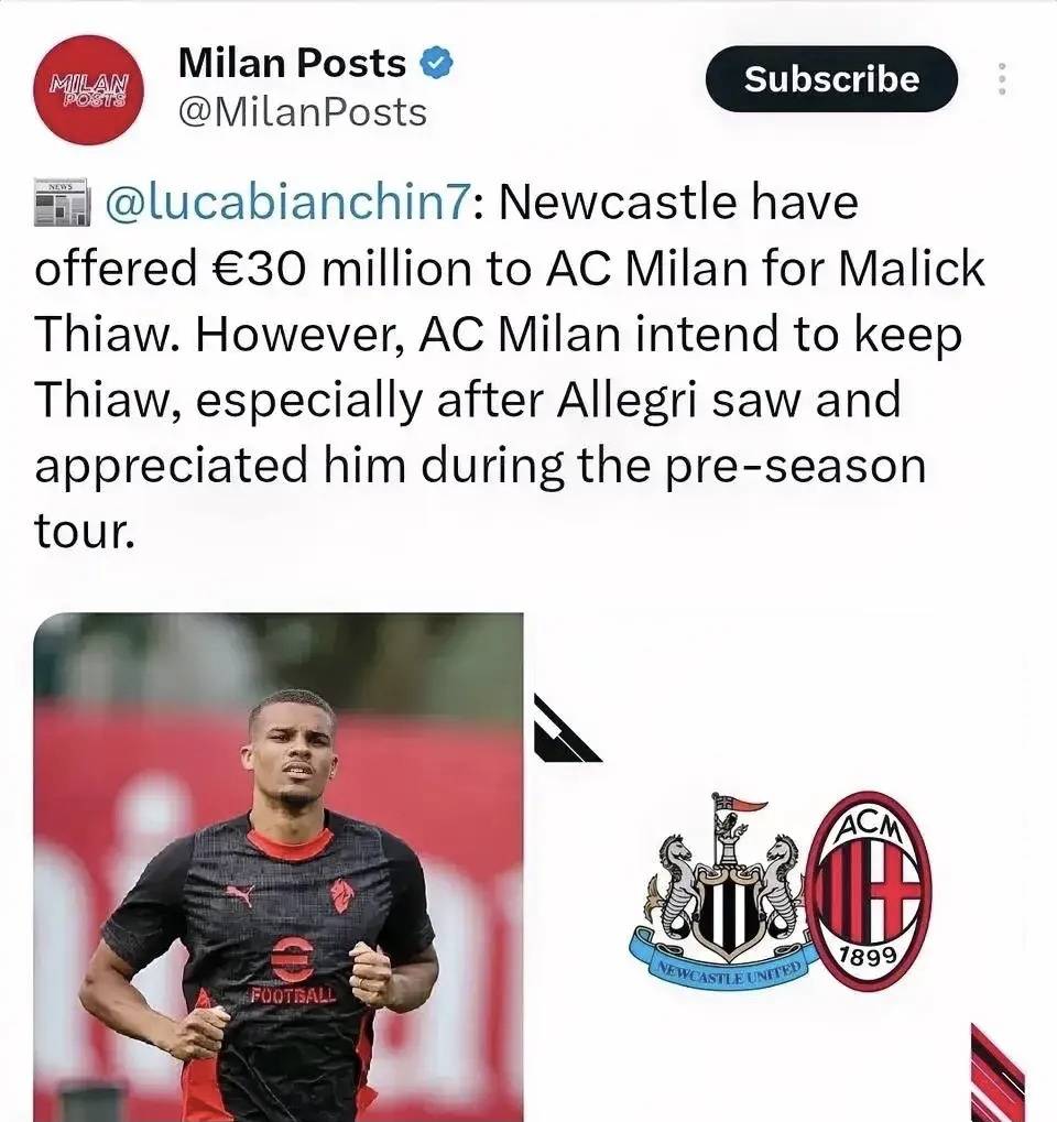比安钦消息说纽卡斯尔已向AC米兰报价3000万欧元求购帝奥。然而,AC米兰打算留下帝奥,尤其是在阿莱格里在季前巡回赛中观察并欣赏了他的表现之后。但龙哥消息说米兰并没有告知啥啥啥,米兰俱乐部只是表达了俱乐部不愿意失去帝奥。这个转会窗口神准的迪马济奥说米兰拒绝了纽卡斯尔俱乐部的首份报价,但米兰并没有表示不愿意出售帝奥。