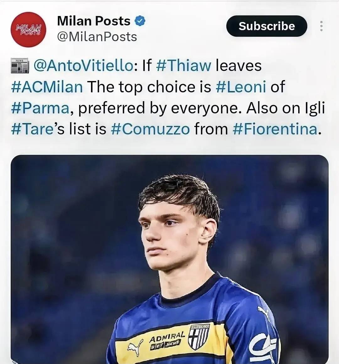 莱奥尼!不用猜测,如果米兰出售帝奥,莱奥尼就是米兰的首要目标,他被所有人欣赏。另外,科穆佐也在塔雷的名单上。个人觉得莱奥尼与科穆佐一直都是米兰的目标,上赛季弗拉尼会计就说过意大利球员会在新赛季米兰阵容中扮演重要的角色,这个莱奥尼与科穆佐从上赛季没结束的时候就已经是目标球员了。