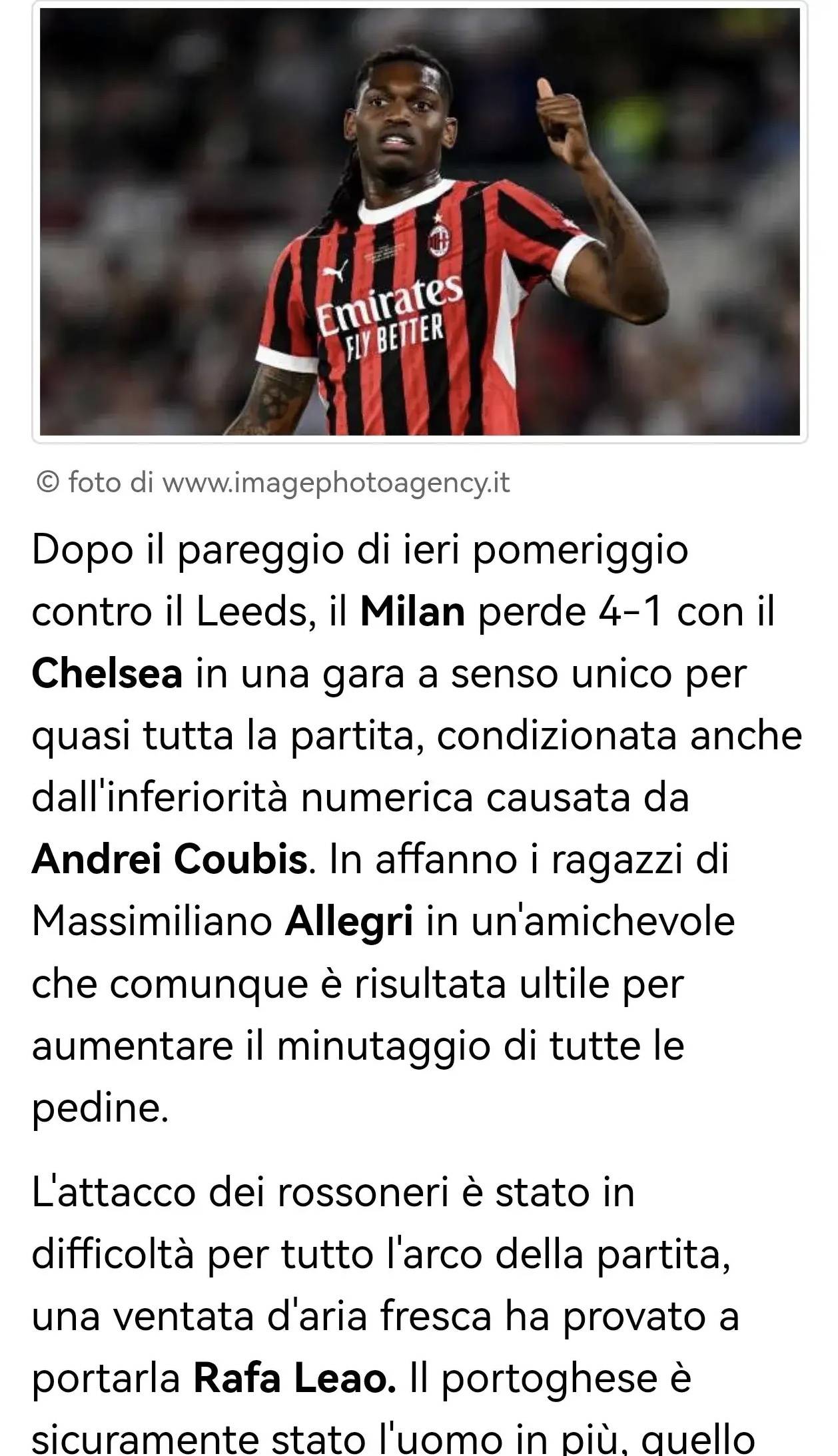 在昨天下午与利兹联战平后,米兰在对阵切尔西的友谊赛中以1-4落败,整场比赛几乎呈现一边倒态势,安德烈·库比斯吃到红牌导致球队人数处于劣势也是重要原因之一。马西米利亚诺·阿莱格里的弟子们在比赛中陷入困境,但这场友谊赛仍起到了增加球员出场时间的作用。