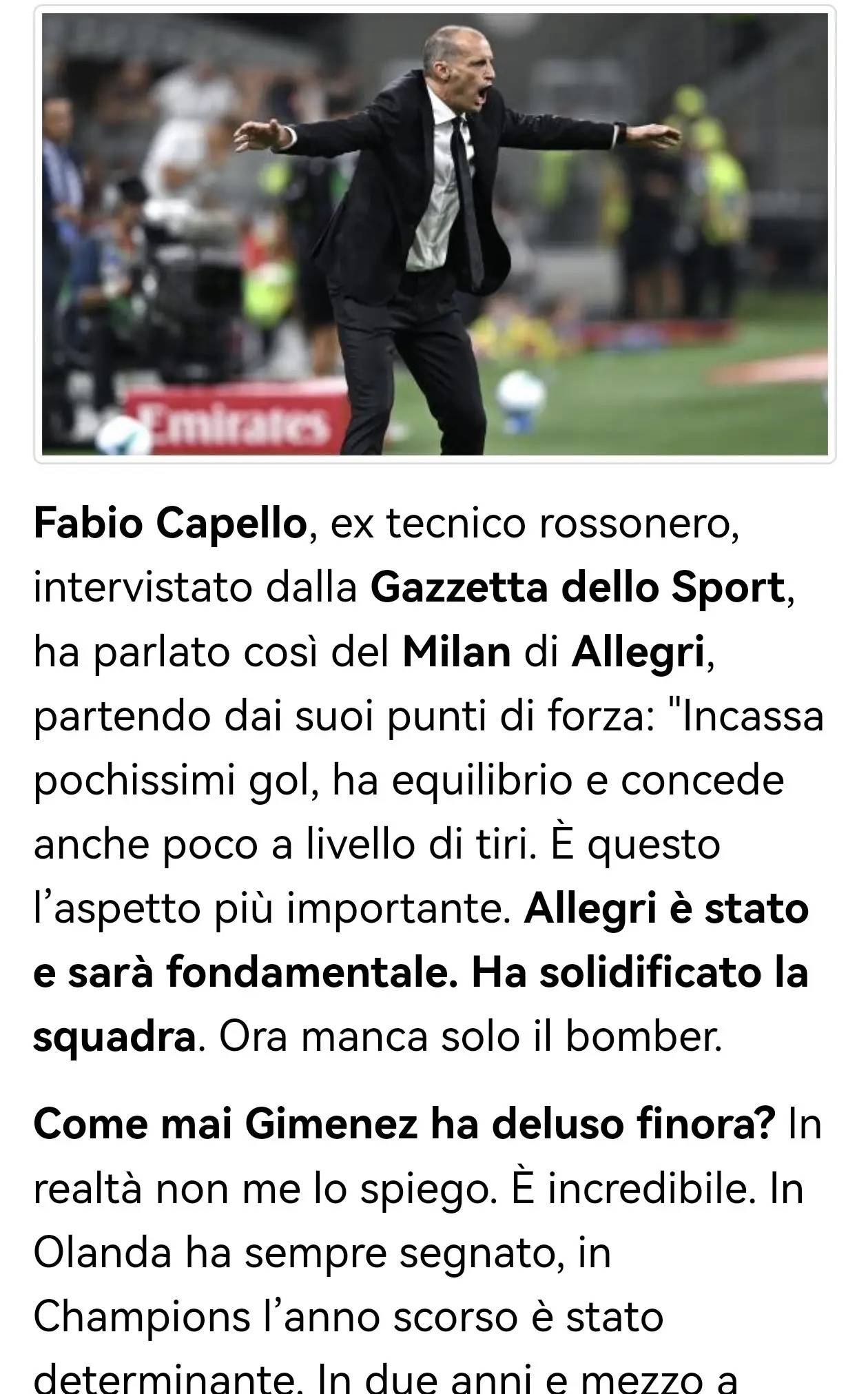 “米兰现在丢球很少,阵容平衡且让对手的射门次数也非常有限,这是最关键的一点。阿莱格里过去是、未来也仍将是球队的核心,是他让球队变得更稳固。目前球队唯一欠缺的,就是一名顶级射手。