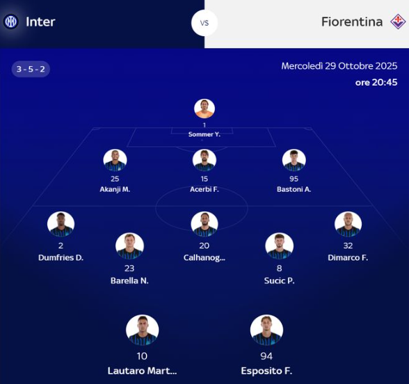 - 意天空:皮奥与劳塔罗出战佛罗伦萨,苏契奇替姆希塔良 (2025/10/29 16:09)