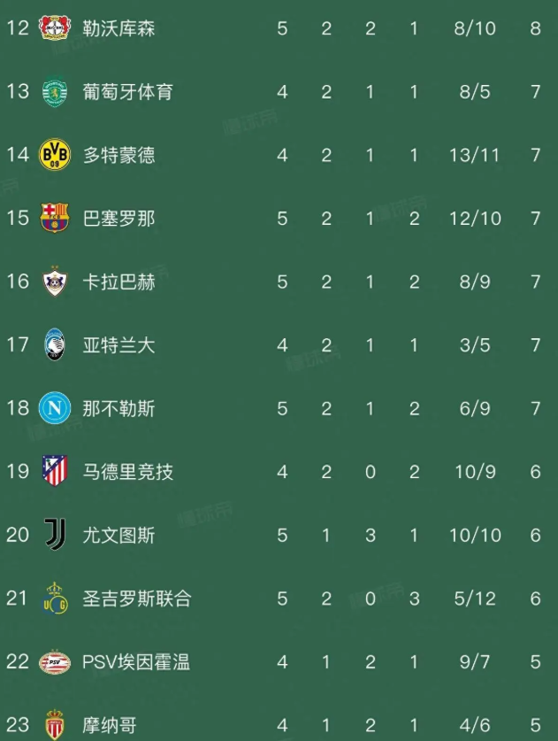 欧冠积分榜更新:尤文逃离垫底区,那不勒斯升第18