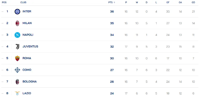 北京时间12月29日,意甲第17轮基本战罢,仅剩罗马VS热那亚一场,积分榜情况如下:
