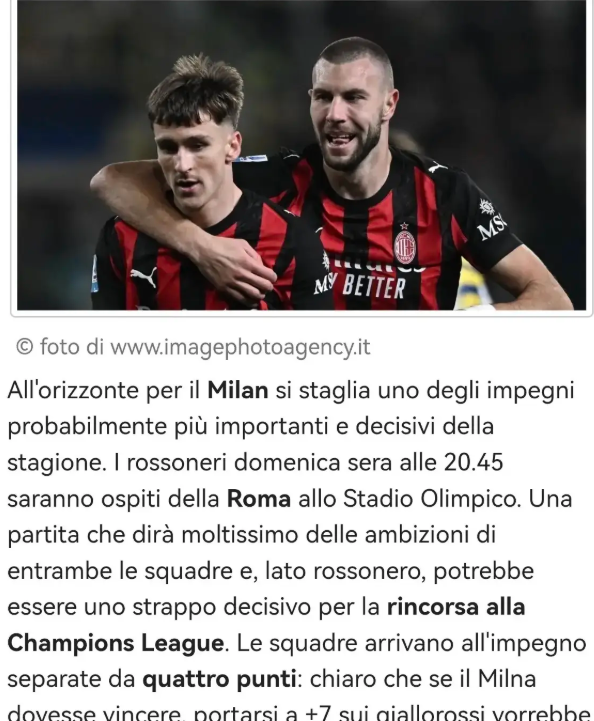 目前两队积分差距为4分,显然,如果米兰能够取胜,就能将领先优势扩大至7分,意义重大;反之若是失利,球队竞争这项欧洲顶级赛事资格的形势将变得更加混乱复杂。
