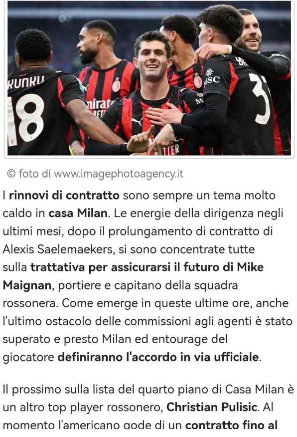 续约一直是米兰队内的焦点话题。在完成阿莱西奥·萨勒马克尔斯的续约后,俱乐部管理层近几个月的精力均集中于与球队队长、门将迈克·迈尼昂的续约谈判,以锁定其未来。据近日消息,经纪人佣金这一最后障碍已被清除,米兰与球员团队很快将正式敲定协议。