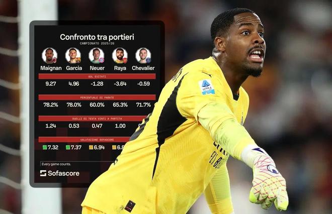 25/26赛季,米兰迈尼昂状态明显复苏,多次在关键比赛中力挽狂澜。据专业机构统计,法国国门的实际失球数要比预期失球数少9.27个,该项数据排名欧洲五大联赛第1位。好消息是,米兰即将以队内顶薪与其续约至2031年。