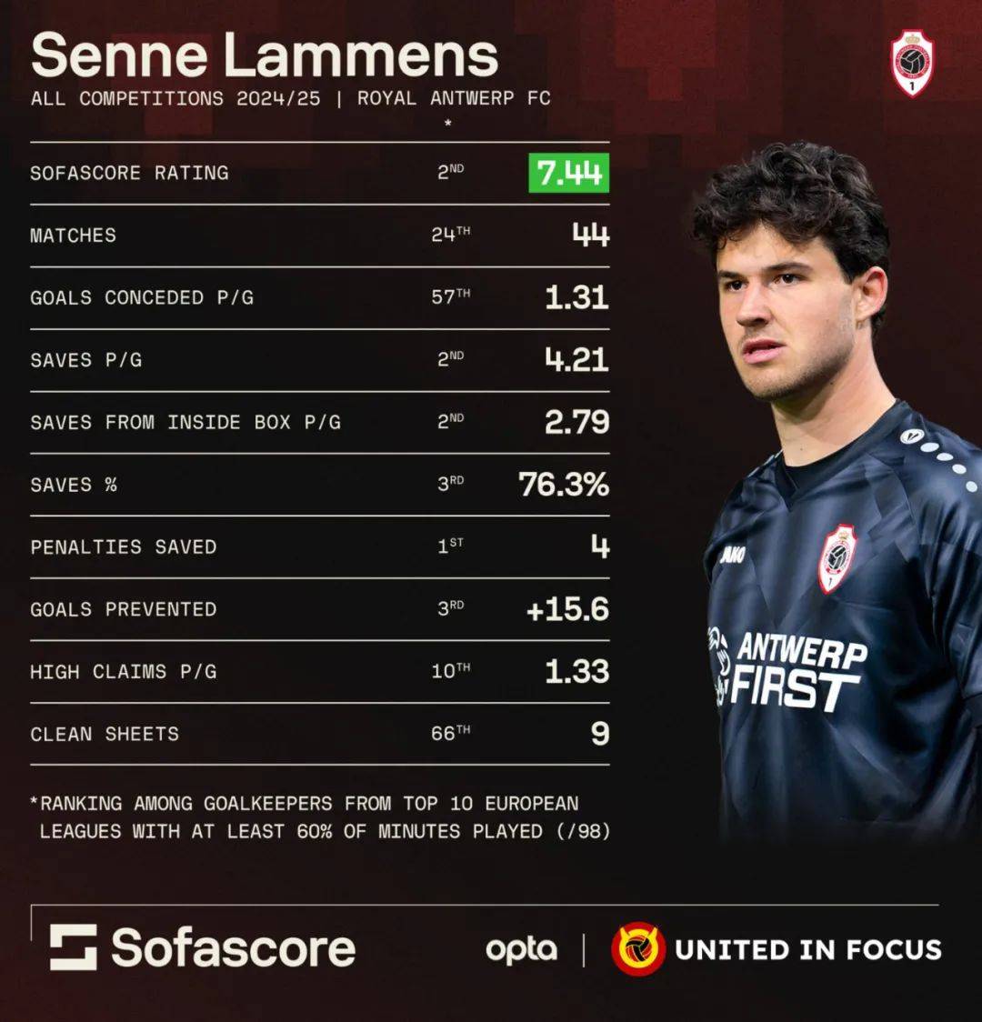比利时皇家安特卫普门将塞纳·拉门斯(Senne Lammens)已经同意今夏加盟曼联,最终能否加盟就看两家俱乐部能否在转会费上达成一致。这位23岁的天才与阿斯顿维拉的埃米利亚诺·马丁内斯并列在鲁本·阿莫林的新守门员候选名单上,但后者加盟难度更大。