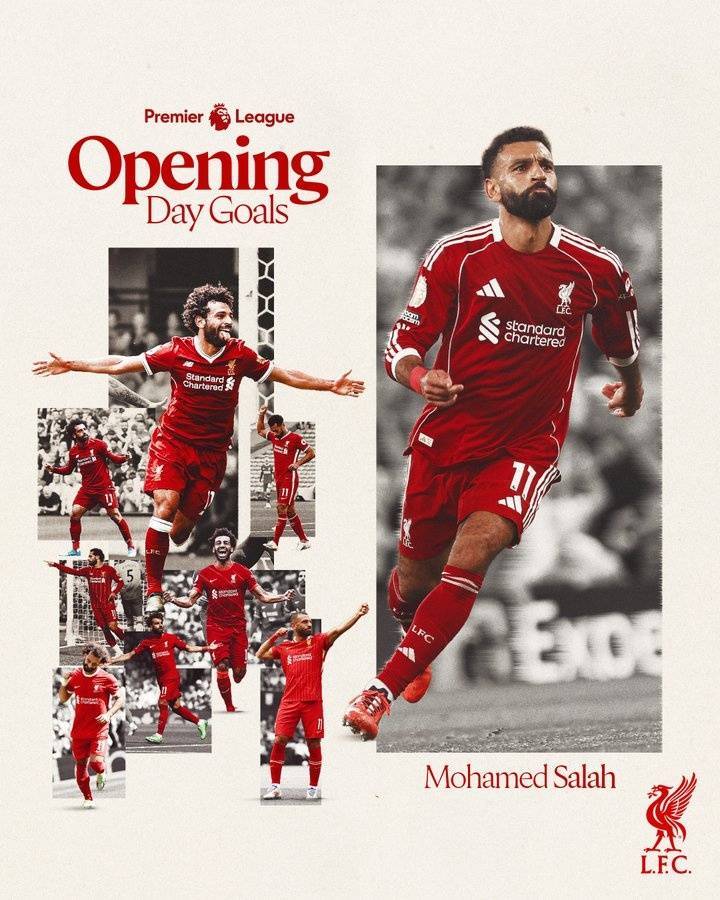 利物浦官推为海报配文:“萨拉赫是英超历史上首位打进10个揭幕战进球的球员!”