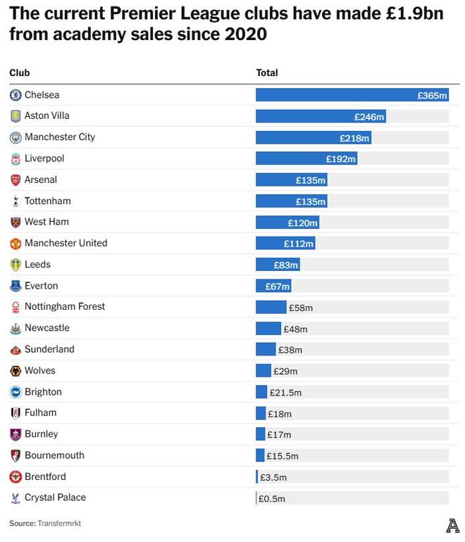 其中,TA对目前英超20支球队近5年自家青训球员出售的情况进行了统计,切尔西从青训球员身上收获3.65亿镑转会费为20队中最多的。