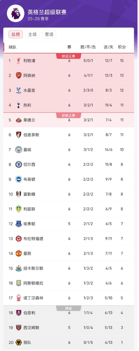 在最新的积分榜中,利物浦目前积15分排在榜首,阿森纳积13分排在次席,3-5位分别是水晶宫、热刺和桑德兰,曼联仅排在第14位。