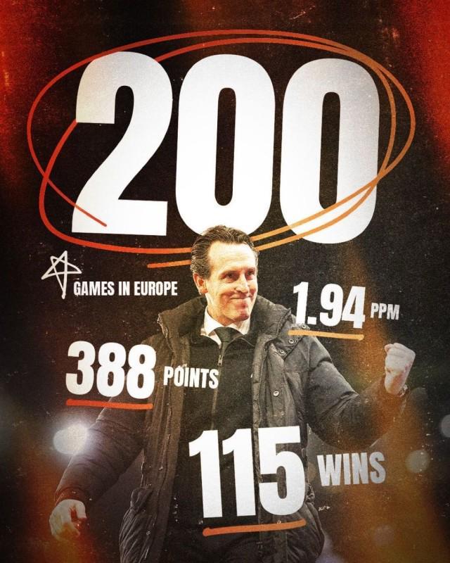 这是维拉主帅埃梅里执教生涯第200场欧战比赛,取得115场胜利,赢得4次欧联杯冠军。2023-24赛季维拉重返欧战以来,埃梅里率队赢得16场欧战胜利,同期只有皇马(19胜)、巴黎(18胜)和拜仁(17胜)更多。