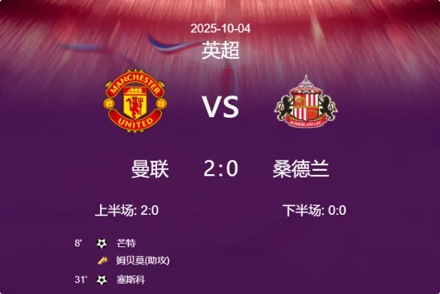 北京时间10月4日晚,2025/2026赛季英超联赛第七轮继续进行,“红魔”曼联坐镇老特拉福德迎战桑德兰。比赛中芒特率先破门,随后赛斯科连续两轮联赛取得进球,最终曼联主场2-0战胜桑德兰,取得联赛主场三连胜,阿莫林个人执教曼联第50场里程碑获得胜利。