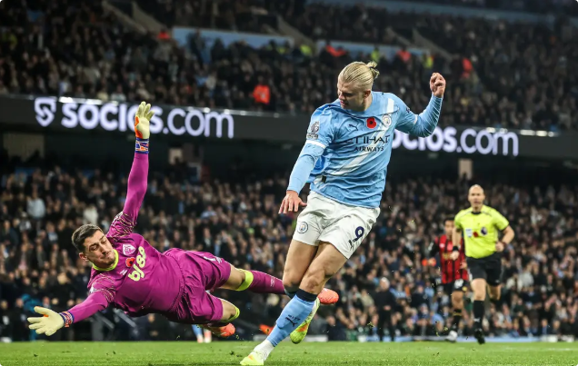 第16分钟,冈萨雷斯中场挑传,谢尔基头球摆渡,哈兰德单刀机会推射破门,曼城1-0伯恩茅斯。