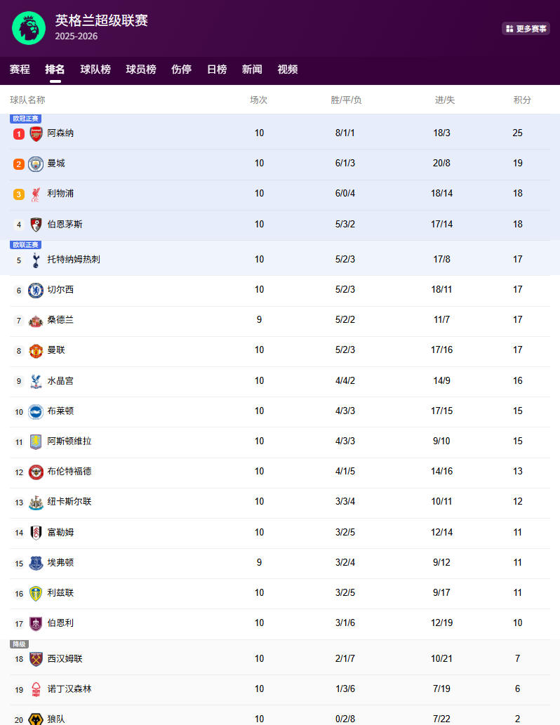 热刺、切尔西、桑德兰和曼联的积分都是17分暂列第5-第8名,热刺本轮0-1不敌切尔西,桑德兰本轮的比赛还没有进行,对手是埃弗顿,曼联三连胜脚步被终结,2-2和诺丁汉森林握手言和。水晶宫16分暂列第9名。阿斯顿维拉和布伦特福德都是15分暂列第10和第11名。
