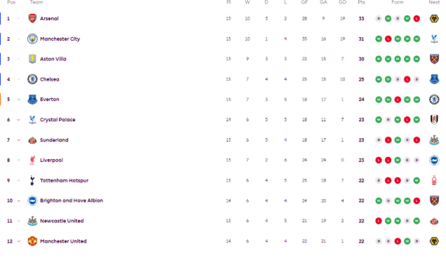 北京时间12月7日,英超第15轮战罢多场,仅剩布莱顿VS西汉姆;富勒姆VS水晶宫;狼队VS曼联三场未战,积分榜情况如下: