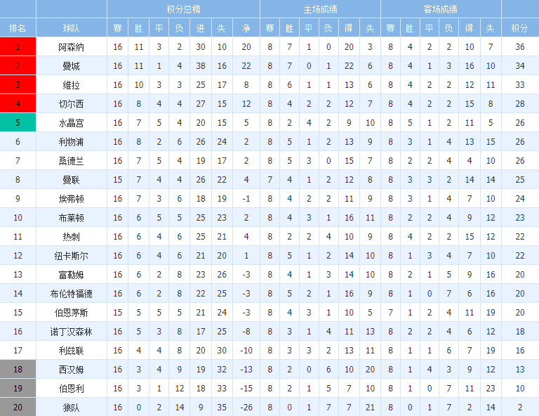 - 英超积分榜:枪手5分领跑 切尔西升4利物浦升6坐等曼联 (2025/12/14 09:57)