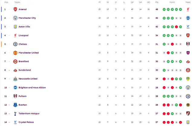 曼城战平后与维拉获胜后平分,蓝月凭借净胜球优势暂居第二。