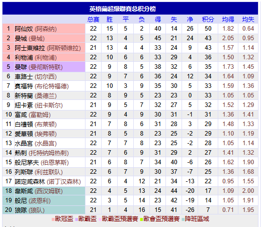北京时间1月18日,英超第22轮战罢多场,积分榜情况如下: