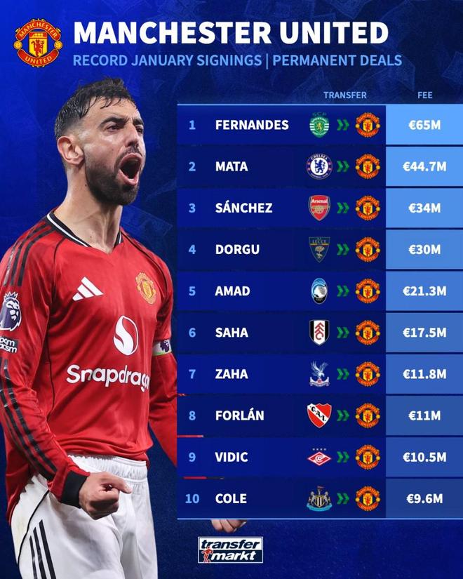 北京时间1月19日,德转统计出了曼联队史冬窗最贵的10笔引援,布鲁诺-费尔南德斯6500万欧元高居第一,马塔4470万欧元第二,桑切斯3400万欧元第三。