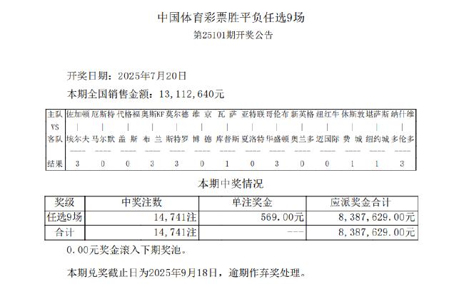 北京时间7月20日,胜负彩第25101期任九开奖结果揭晓。本期任九开出14,741注,单注奖金569元,本期任九投注总额为13,112,640元。
